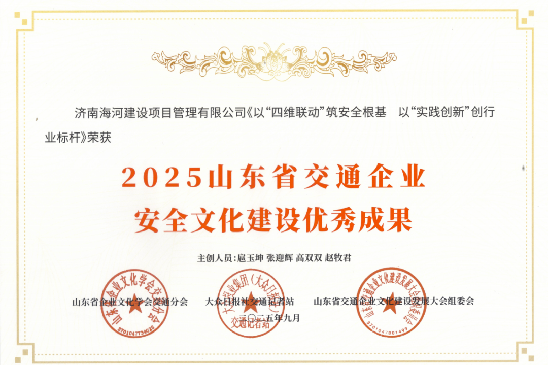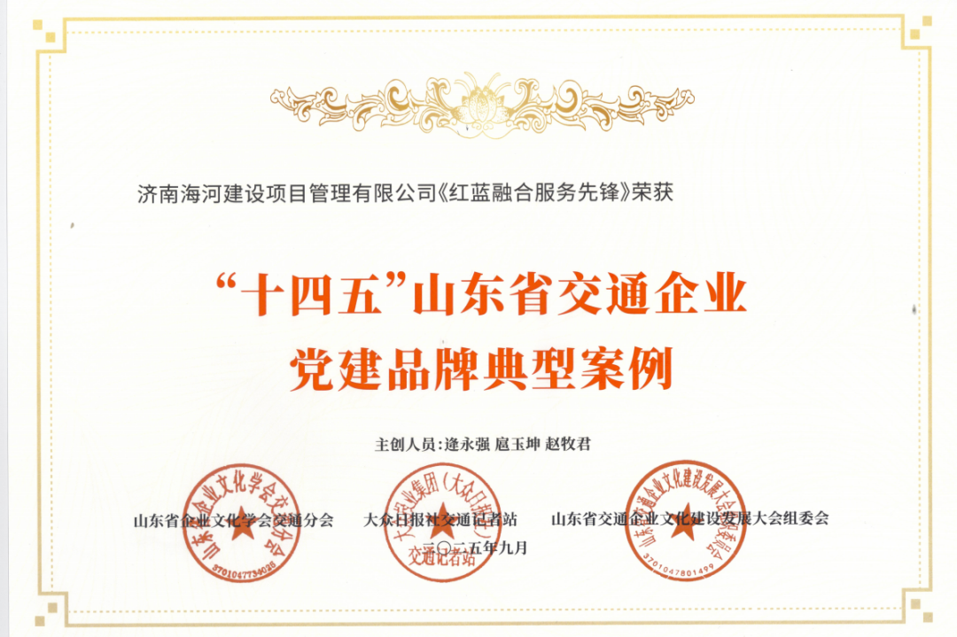 濟(jì)南海河公司在企業(yè)文化、黨建工作與安全管理三大領(lǐng)域齊獲佳績,共斬獲三項交通行業(yè)省級榮譽(yù),充分彰顯了公司在高質(zhì)量發(fā)展道路上的卓越實力與深厚積淀。公司榮獲“2025山東省交通企業(yè)文化建設(shè)先進(jìn)單位”稱號,為行業(yè)企業(yè)文化建設(shè)樹立了優(yōu)秀典范;精心打造的《紅藍(lán)融合 服務(wù)先鋒》黨建案例,因創(chuàng)新性、實效性與引領(lǐng)性兼具,獲評“十四五’山東省交通企業(yè)黨建品牌典型案例”,成為全省交通企業(yè)黨建工作的標(biāo)桿參考;此外,在安全管理領(lǐng)域,公司探索形成的《以“四維聯(lián)動”筑安全根基 以“實踐創(chuàng)新”創(chuàng)行業(yè)標(biāo)桿》文化創(chuàng)新實踐案例,憑借對安全管理模式的突破與優(yōu)化,斬獲“2025山東省交通企業(yè)安全文化建設(shè)優(yōu)秀成果”,為行業(yè)安全文化建設(shè)提供了可復(fù)制、可推廣的實踐經(jīng)驗。